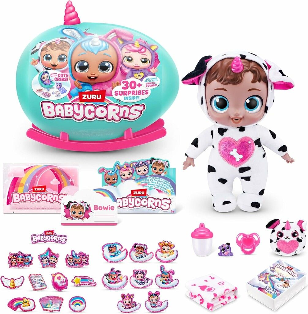 MAS DE 30 SORPRESAS EN EL INTERIOR: DESENVUELVE TU BABYCORN PARA DESCUBRIR LO QUE SE ESCONDE EN EL INTERIOR LUCES Y SONIDOS MAGICOS: MIRA COMO TU BEBE COBRA VIDA CON LUCES Y SONIDOS MAGICOS CUANDO LOS CUIDAS NUTRICION AMOR Y CUIDADO: CUIDA A TU BABYCORN CON SU CHUPETE INCLUIDO MANTA PARA BEBE LIBRO DE CUENTOS Y BOO-BOOCORN DE FELPA. COLECCIONALOS TODOS: HAY 4 ADORABLES BABYCORNS INTERACTIVOS GRANDES PARA COLECCIONAR: POPPY BIBBIE BOWIE Y NICCI. CADA UNO VIENE CON UN CORAZON PARA DESPRENDER Y REVELAR BABYCORNS GAMA PEQUENA: HAZ CRECER TU COLECCION BABYCORNS Y ADOPTA LOS 4 SMALL BABYCORNS TAMBIEN