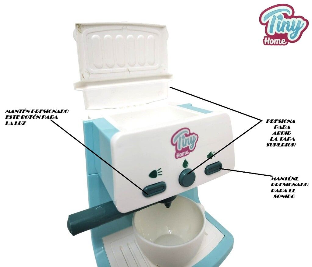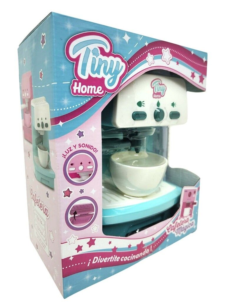 CAFETERA DE JUGUETE CON LUZ Y SONIDO DE LA LINEA TINY HOME. MIDE APROX. 16 CM X 12 CM X 8 CM. REQUIERE DE 2 PILAS AA (NO INCLUIDAS). MARCA: TINY HOME. + 3 ANOS.
