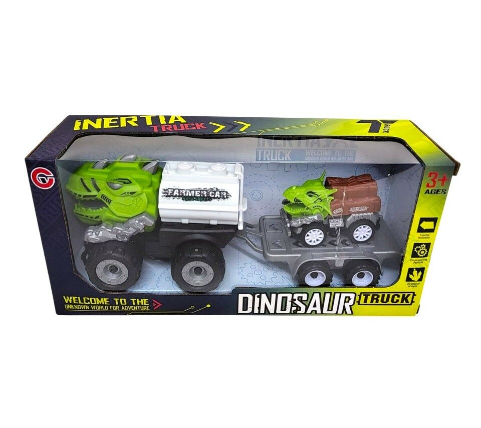 DIVERTITE JUGANDO CON ESTE CAMION DINO DE GRANJA CON ACOPLADO. TODO EL CAMION CON EL ACOPLADO MIDEN APROX. 25 CM DE LARGO X 10 CM DE ALTO. MATERIAL: PLASTICO.