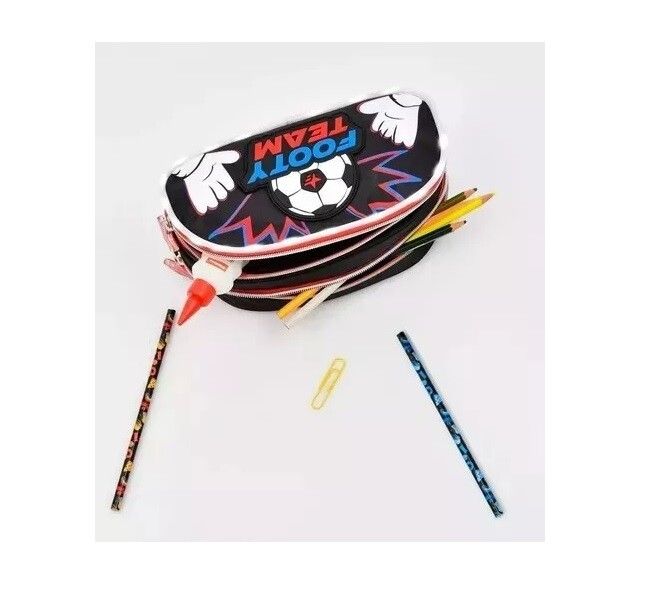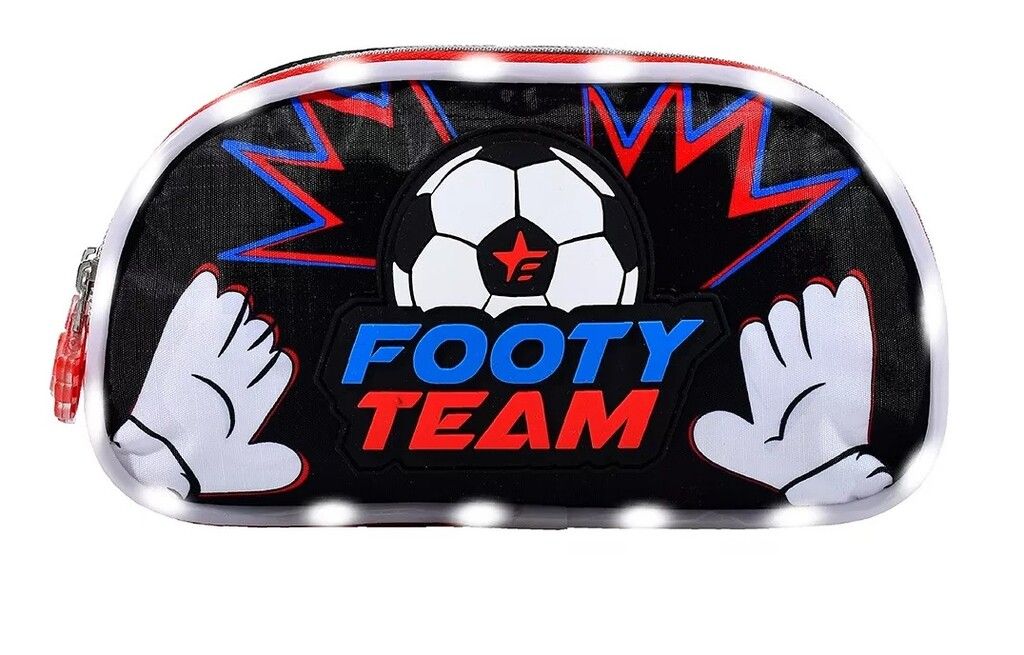 CARTUCHERA DOBLE CIERRE FUTBOL FOOTY TEAM CON LUZ LED CARTUCHERA GRANDE CON DOS COMPARTIMENTOS CON CIERRE. ESTAMPADO AL FRENTE CON APLIQUE DE GOMA EN FORMA DE PELOTA. 22CM LARGO X 14 CM ALTO X 8 CM DE PROFUNDIDAD INCLUYE PILAS