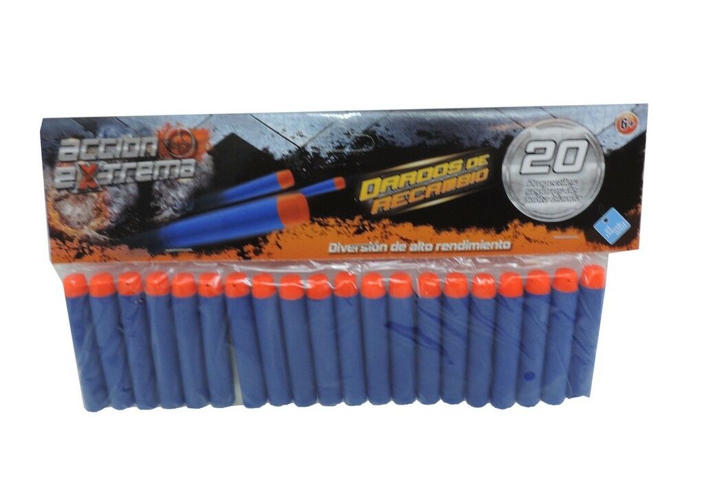 !OBTEN 20 DARDOS DE RECAMBIO. PROYECTILES SEGUROS DE PUNTA BLANDA. ESTE PAQUETE DE 20 DARDOS DE GRAN ALCANCE TE OFRECE LAS MUNICIONES QUE NECESITAS PARA LLEVAR LA DELANTERA EN EL CAMPO DE BATALLA. !APROVISIONATE DE MUNICIONES CON ESTE PAQUETE DE 20 DARDOS ACCION EXTREMA!