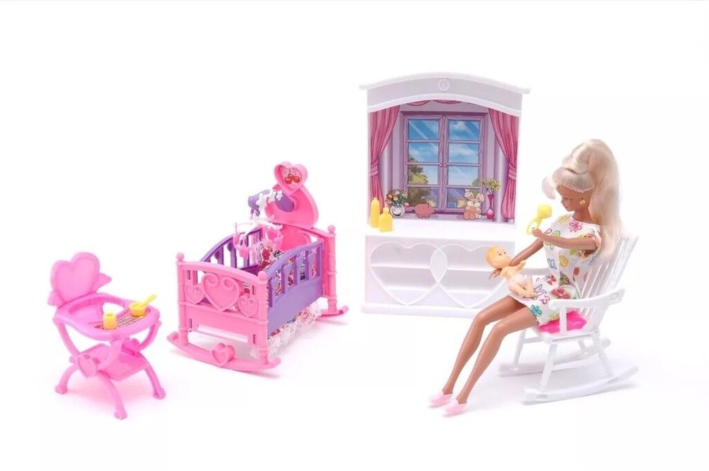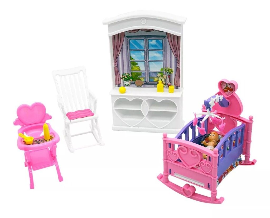 SET GLORIA – EL CUARTO DEL BEBE CON ACCESORIOS -MUEBLES Y ACCESORIOS PARA MUNECAS DE 29 CM (NO INCLUIDAS) -COMPLETISIMO CUARTO PARA EL BEBE -IDEAL PARA ACOMPANAR TUS OTROS SET PARA MUNECAS -APTO PARA BARBIES Y SIMILARES LA OFERTA INCLUYE – CUNA MECEDORA CON SABANA Y MOVIL – MUEBLE CON ALZADA Y ESTANTES EN FORMA DE CORAZON – SILLA DE COMER – SILLA MECEDORA – ACCESORIOS: PLATO HONDO CON CUCHARA VASITO SONAJERO MAMADERA Y TALQUERA. – INCLUYE BEBE ARTICULADO – LAS FOTOS SON ILUSTRATIVAS LOS COLORES PUEDEN VARIAR – MARCA: GLORIA