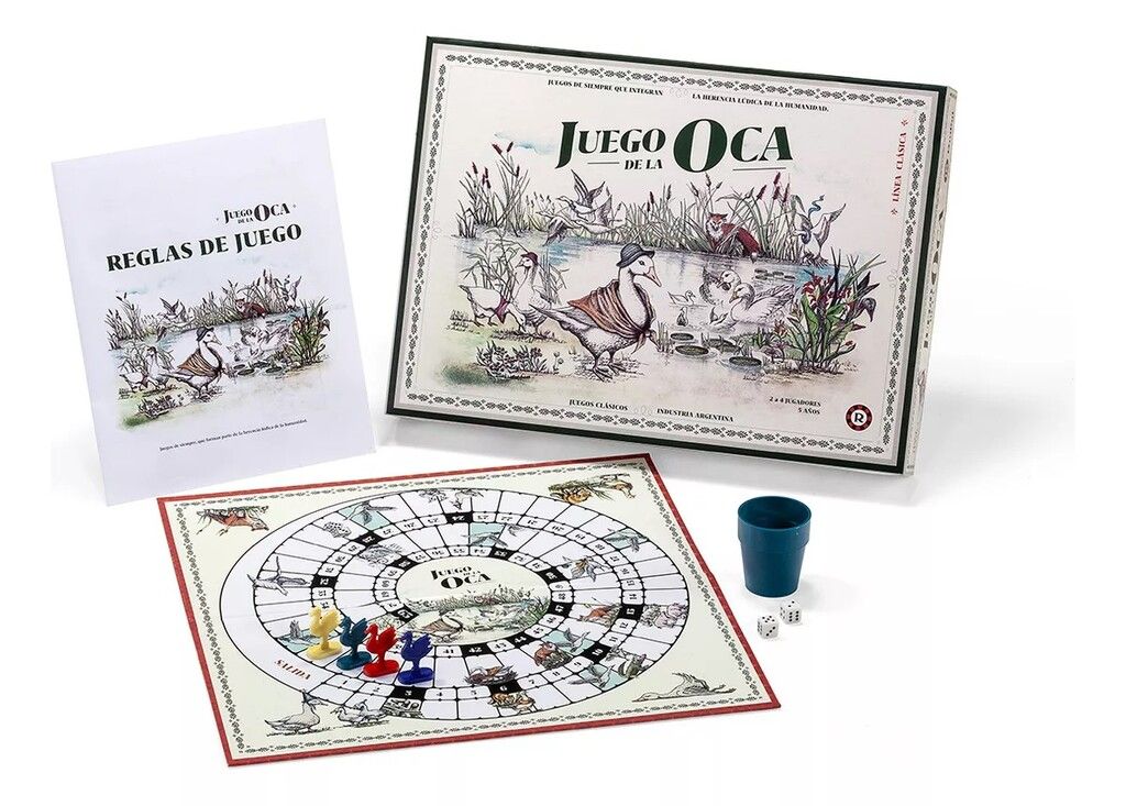 UNA VERSION DE LUJO PARA EL TRADICIONAL JUEGO DE LA OCA. CONTENIDO: 1 TABLERO 4 OCAS PLASTICAS 2 DADOS 1 CUBILETE 1 REGLAMENTO. EDAD + 4 | JUGADORES 2 A 4 | MEDIDAS 375 X 270 X 55 MM