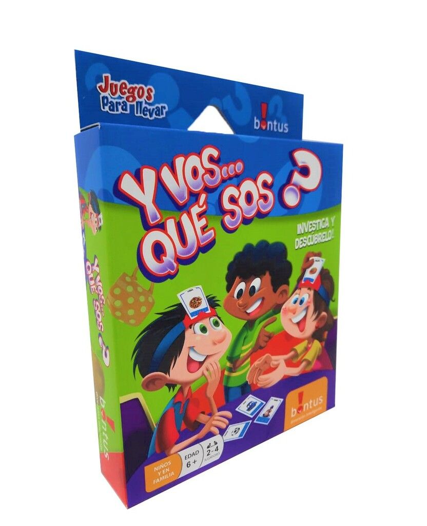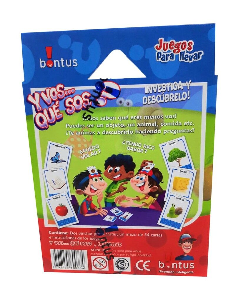 Y VOS… QUIEN SOS? INVESTIGA Y DESCUBRILO! JUEGO CON CARTAS ESPECIALES PARA INTERACTUAR Y DESCUBRIR- TODOS SABEN QUIEN SOS MENOS VOS- PUEDES SER UN ANIMAL- COMIDA U OBJETO. TE ANIMAS A DESCUBRIRLO HACIENDO PREGUNTAS? CONTENIDO- – 1 MAZO DE 54 CARTAS – 2 BANDAS PORTA-TARJETAS INSTRUCCIONES DE JUEGO EDAD IDEAL DE USO- +6 ANOS CANTIDAD DE JUGADORES- DE 2 A 6 JUGADORES MEDIDAS DE LA CAJA CONTENEDORA- 19.5 CM DE ALTO X 3.5 CM DE ANCHO X 14 CM DE LARGO PESO- 150 GRAMOS MARCA- BONTUS ORIGEN- NACIONAL
