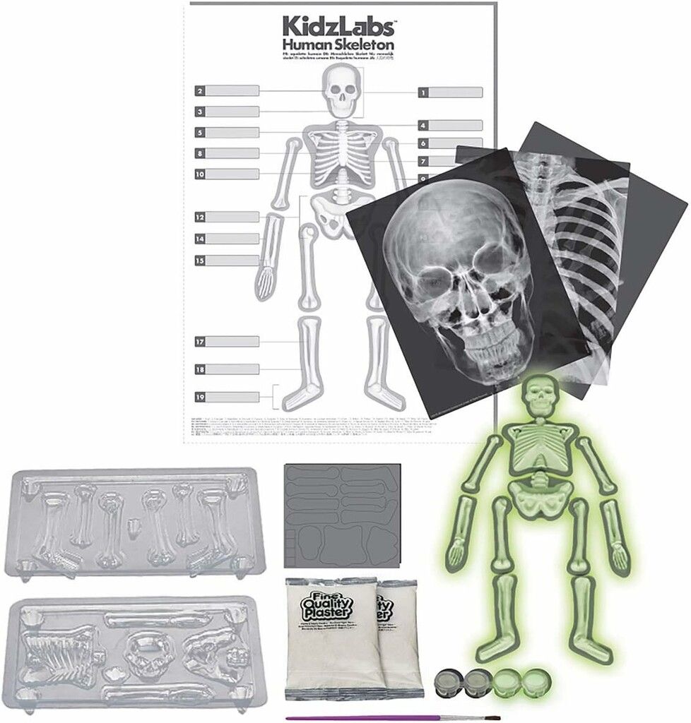 APRENDE SOBRE EL INCREIBLE ESQUELETO HUMANO CON EL KIT DE CIENCIA DE ESQUELETO HUMANO 4M KIDZLABS GLOW HUMAN SKELETON SCIENCE. MONTAR UN ESQUELETO HUMANO COMPLETO CON YESO E IMANES PARA CREAR UNA FASCINANTE EXHIBICION ANATOMICA. CUANDO SE PINTAN LOS HUESOS BRILLAN EN LA OSCURIDAD PARA UNA DIVERSION EXTRA. LAS PELICULAS MAGICAS DE RAYOS X SE INCLUYEN CON EL KIT DE VER A TRAVES DE LA PIEL Y REVELAN LOS HUESOS DEBAJO.