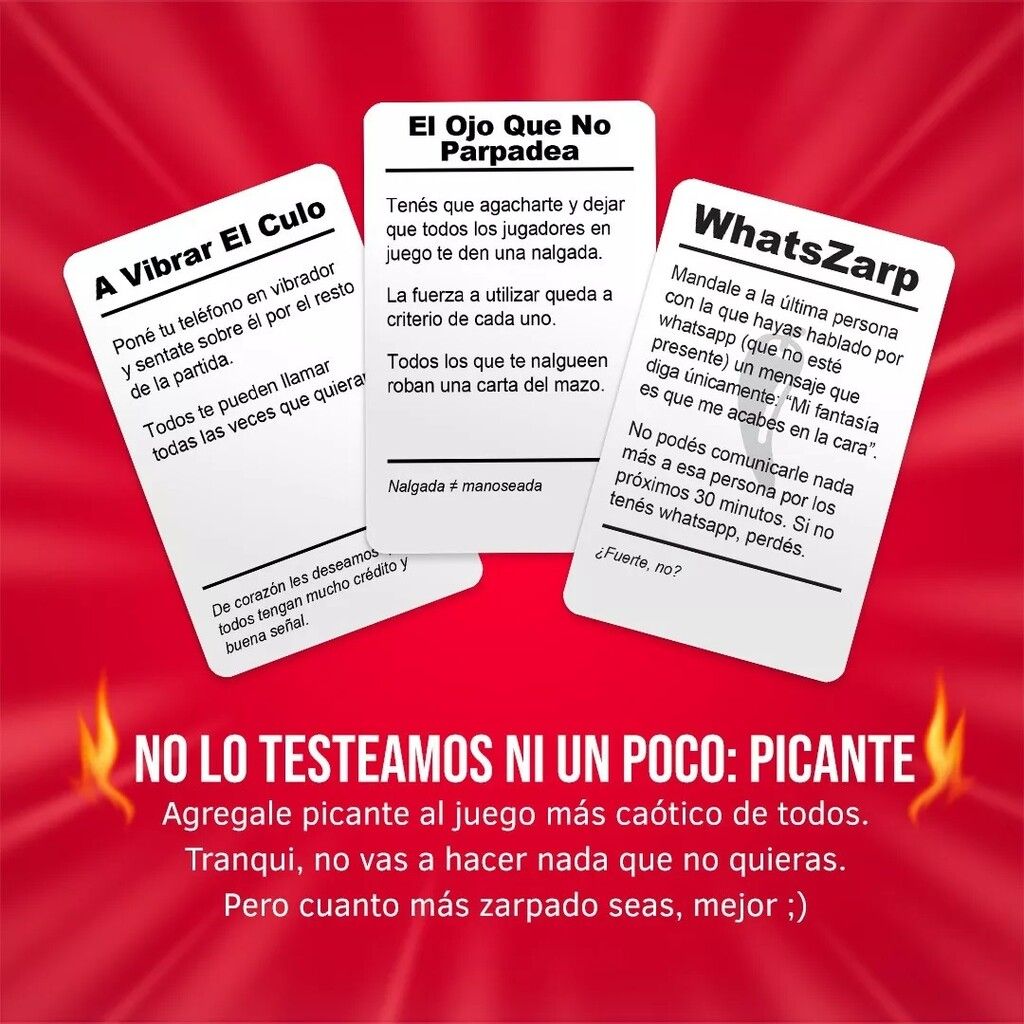 JUEGO DE CARTAS NO LO TESTEAMOS NI UN POCO PICANTE 69 CARTAS Y MUCHOS CHISTES CON DOBLE SENTIDO. EN REALIDAD BASTANTE DIRECTOS. LA EXPANSION MAS ZARPADA DEL NO LO TESTEAMOS. YA TE CALENTASTE CON TUS AMIGOS QUE TE HICIERON PERDER AHORA CALENTATE CON ESTAS PRENDAS. REQUIERE EL NLT BLANCO O NEGRO PARA JUGAR. !NO LO TESTEAMOS ES UN JUEGO DE ELIMINACION! GANA EL QUE ELIMINA A TODOS LOS DEMAS Y CADA CARTA TE SIRVE PARA ELIMINAR A TODOS LOS DEMAS DE LAS MANERAS MAS BIZARRAS POSIBLES. TE LO RECOMENDAMOS PARA JUGAR DE A CINCO O MAS JUGADORES DESDE LOS 18 ANOS. TIEMPO DE JUEGO 3-15 MINUTOS. CONTIENE 69 CARTAS Y 1 DADO. PRODUCTO 100% ORIGINAL CON LICENCIA OFICIAL FABRICADO POR BUREAU DE JUEGOS.