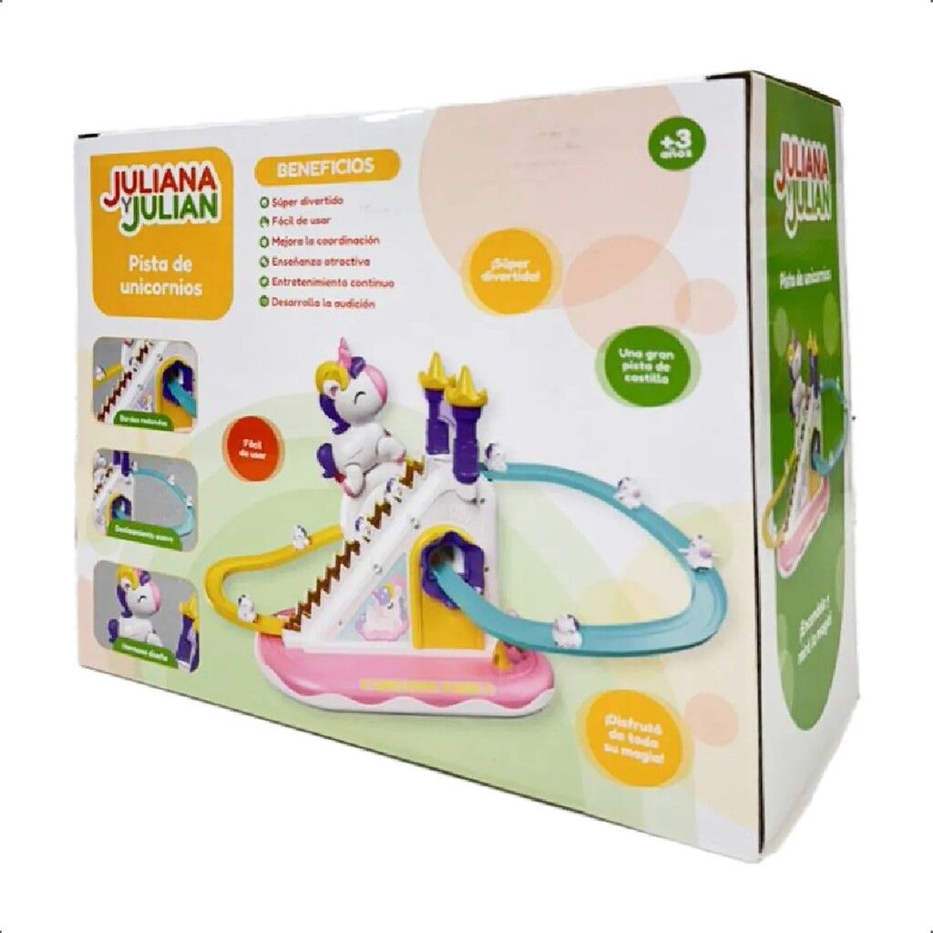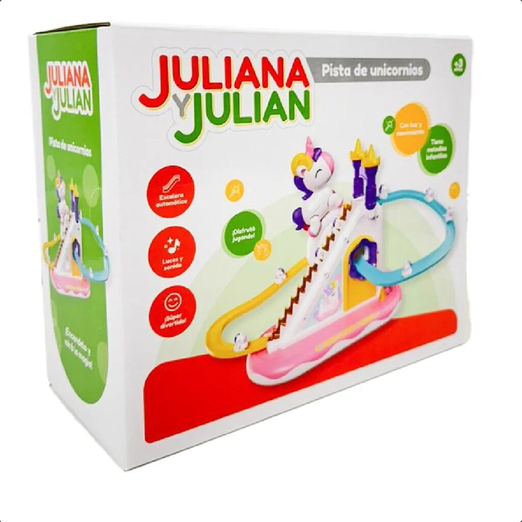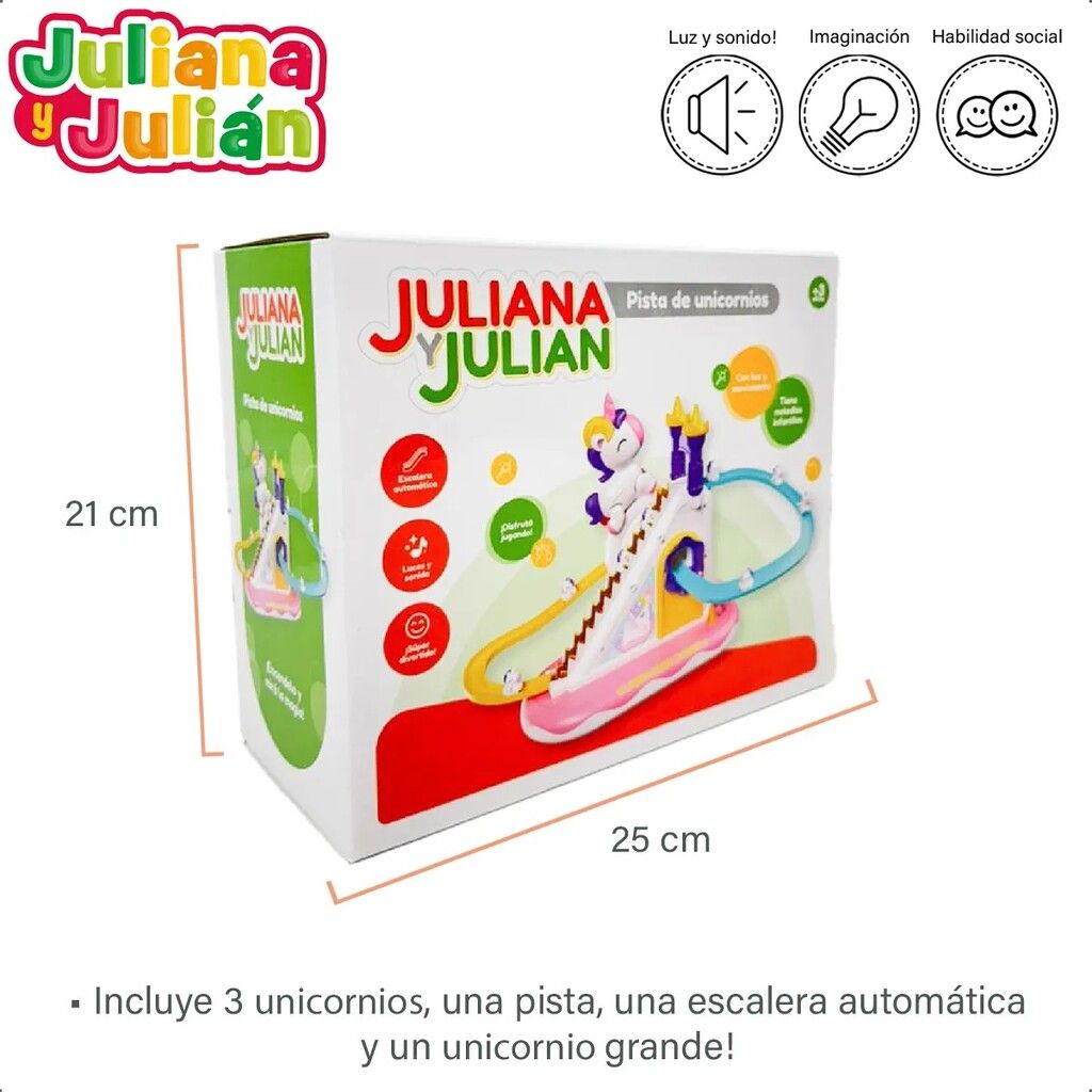 JULIANA Y JULIAN PISTA DE UNICORNIOS ESCALERA AUTOMATICA CON LUZ Y SONIDO! DESCRIPCION DEL PRODUCTO ? PISTA DE UNICORNIOS ? MEDIDA PACKAGING: 21 CM X 25 CM X 115 CM ? INCLUYE 3 UNICORNIOS UNA PISTA UNA ESCALERA AUTOMATICA UN UNICORNIO GRANDE ? CON LUCES Y SONIDO! ? CUENTA CON MOVIMIENTO ? CUENTA CON BOTON PARA ENCENDER CON SONIDO O ENCENDIDO PERO SIN SONIDO! ? SUPER DIVERTIDO! ? UTILIZA 2 PILAS AA (NO INCLUIDAS) ? EDAD RECOMENDADA: +3 ANOS ? LAS ESPECIFICACIONES COLORES Y CONTENIDO PUEDEN VARIAR CON RESPECTO A LA ILUSTRACION. ? CODIGO: JYJ0049