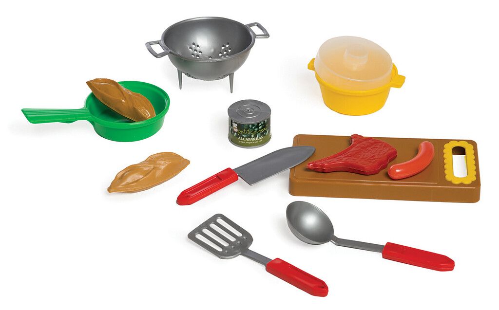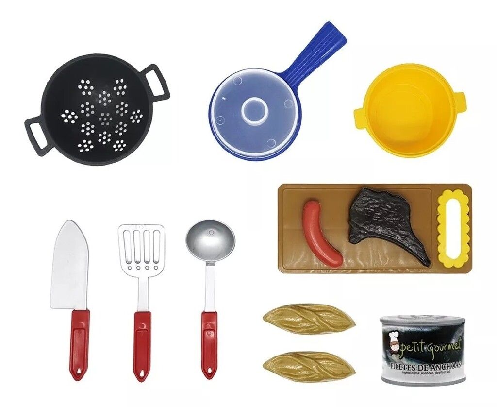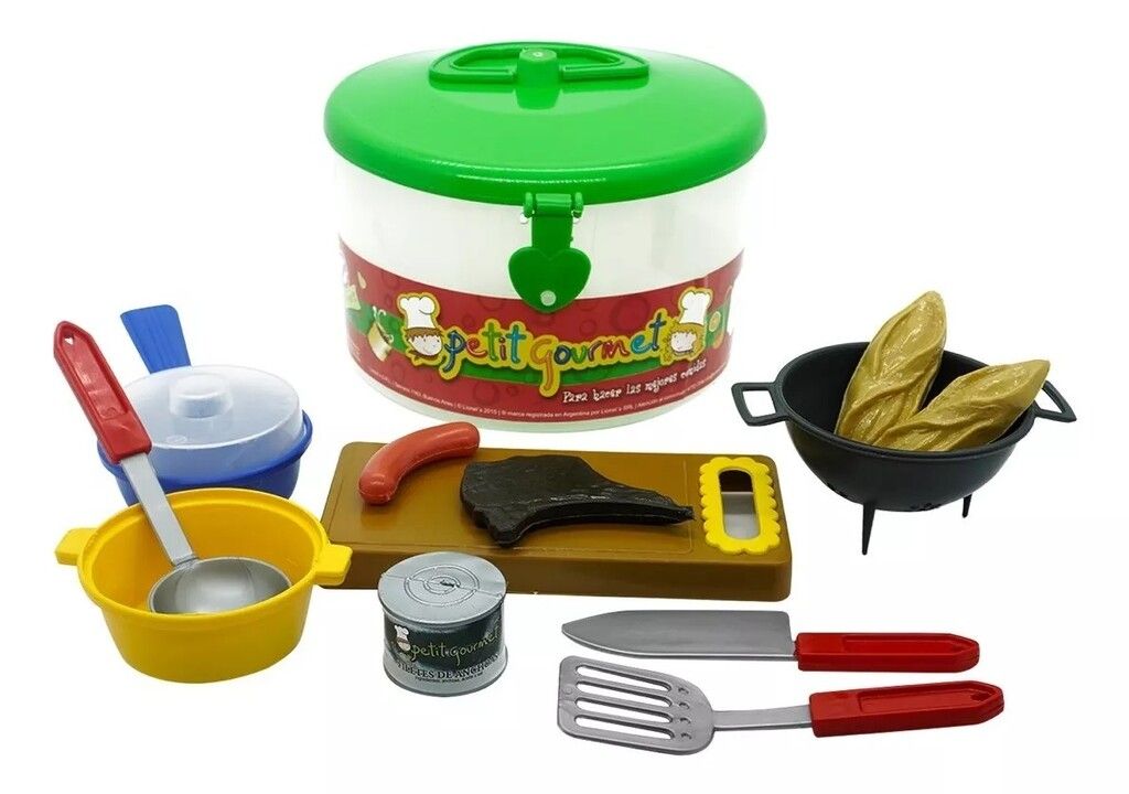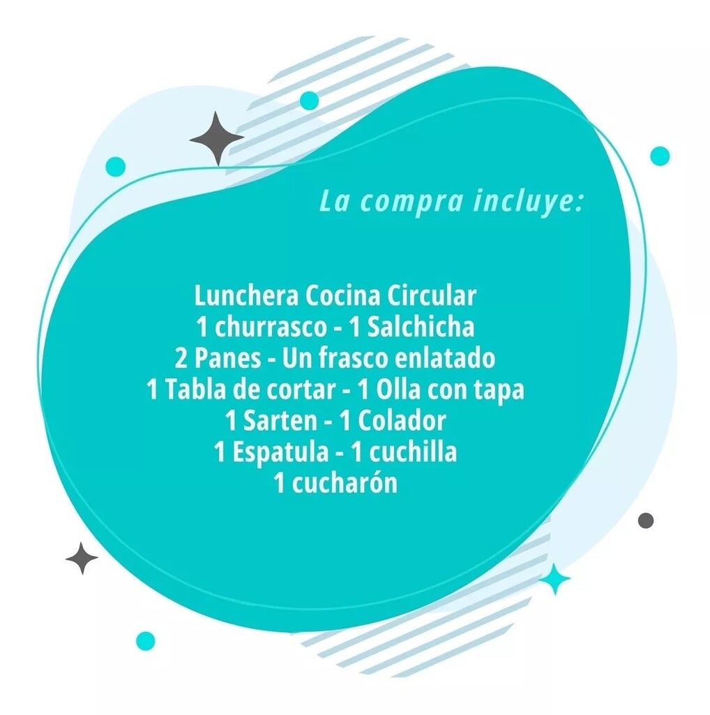 LINDO SET CON LUNCHERA DE COCINA VIENEN EN 2 COLORES PERO NO SON A ELECCION ?1 CHURRASCO ?1 SALCHICHA ?2 PANES ?UN FRASCO ENLATADO ?1 TABLA DE CORTAR ?1 OLLA CON TAPA ?1 SARTEN ?1 COLADOR ?1 ESPATULA ?1 CUCHILLA ?1 CUCHARON MARCA LIONELS