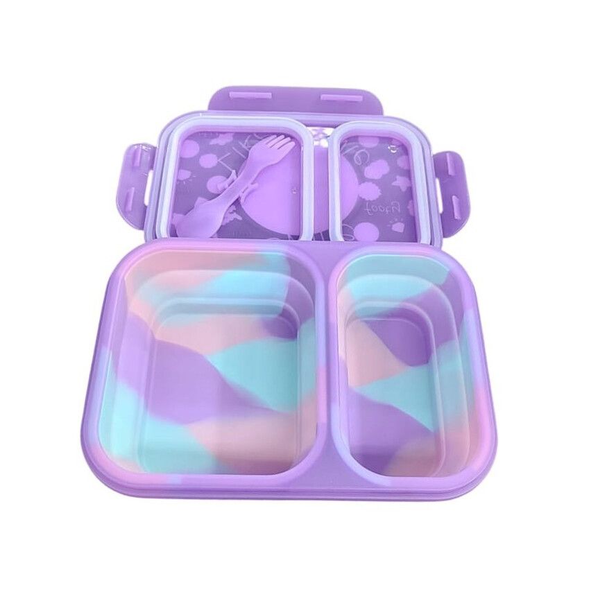 CONTENEDOR PLEGABLE DE SILICONA CON SISTEMA DE CIERRE CLIP HERMETICO. 2 COMPARTIMIENTO EXPANSIBLE AL DOBLE DE SU TAMANO APTO PARA LAVAVAJILLAS Y MICROONDAS SIN TAPA CUBIERTO INTEGRADO MEDIDAS APROXIMADAS: 21 CM DE ALTO X 145 CM DE ANCHO X 14CM DE LARGO