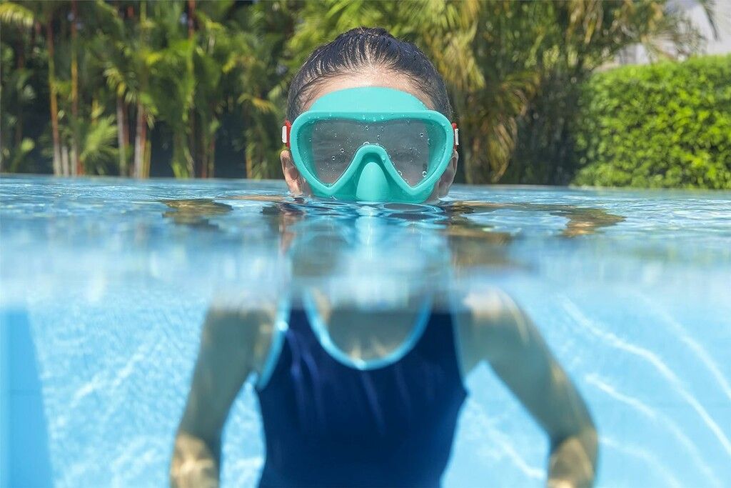 LENTES DE POLICARBONATO CON REVESTIMIENTO PROTECTOR UV. FALDA DE DOBLE BORDE DE PLUMAS PARA UN AJUSTE PRECISO Y RESISTENTE A LAS FUGAS. CORREA DE CABEZA DIVIDIDA TOTALMENTE AJUSTABLE. 100% LIBRE DE LATEX. CONTENIDO- UNA MASCARA.