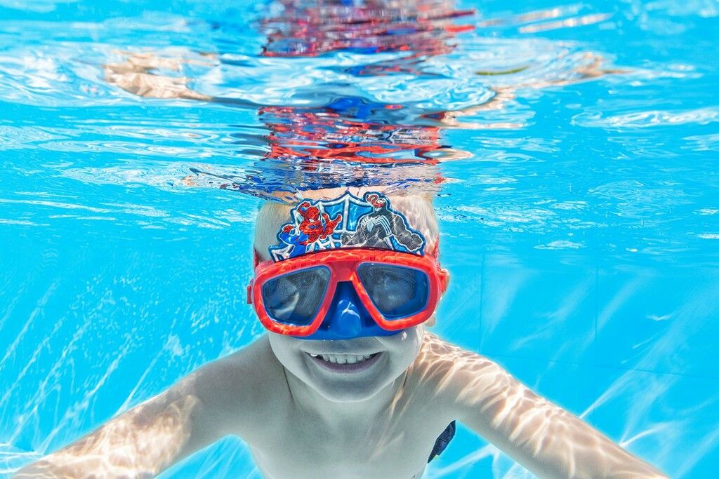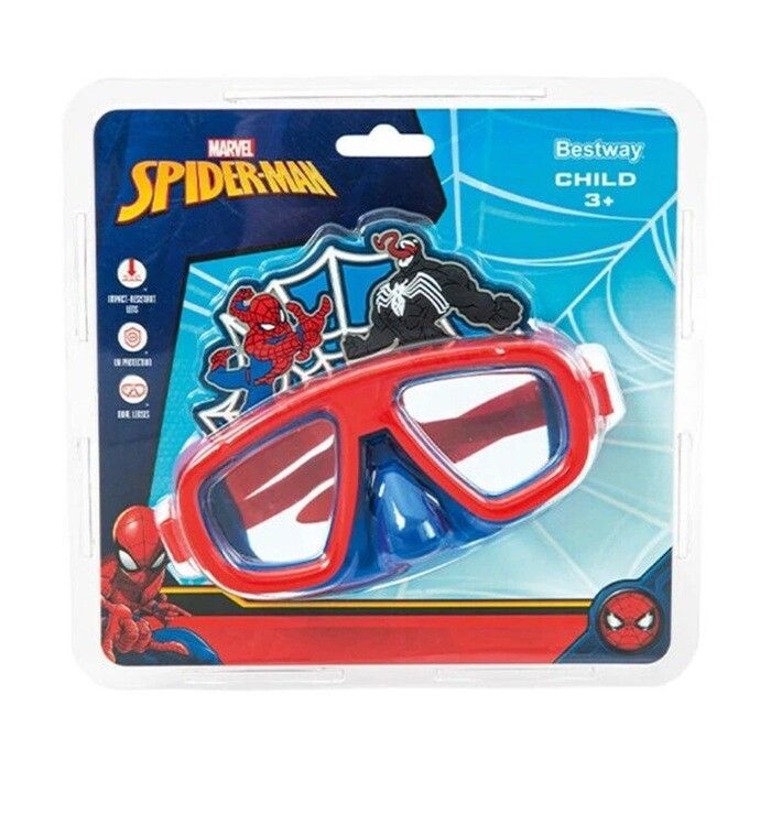 PERFECTO PARA NINOS A PARTIR DE 3 ANOS. DISENO DE SPIDER-MAN? DE MARVEL® EN EL BORDE EXTERIOR CON SU ARCHIENEMIGO. LENTES DE POLICARBONATO RESISTENTES A IMPACTOS CON REVESTIMIENTO DE PROTECCION UV PARA PROTEGER LOS OJOS DE LOS NINOS. FALDON CON BORDE RESISTENTE A FUGAS Y CORREA AJUSTABLE PARA LA CABEZA. HECHO DE MATERIALES SIN LATEX.