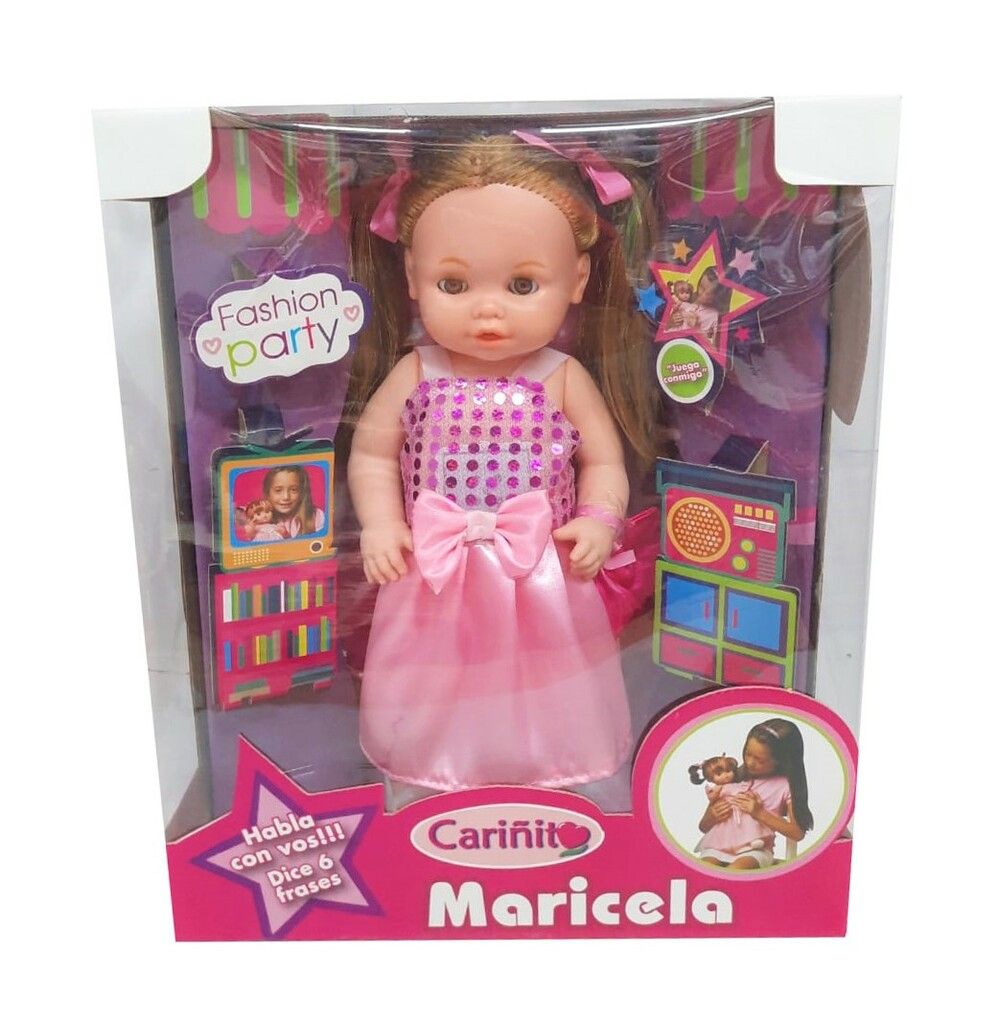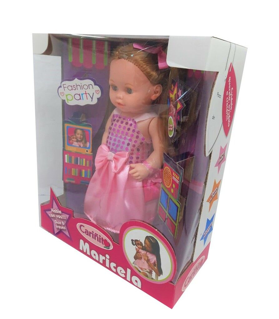 – LLEGO LA HORA DE IR A BAILAR CON LA MUNECA MARICELA QUE HABLA FASHION PARTY! TE DIVERTIRAS JUGANDO SIN PARAR. – HABLA CON TU MUNECA! CONTIENE 6 TIPOS DE FRASES DIFERENTES- » ERES LINDA!»- »DAME UN BESO!»- »TE QUIERO MUCHO!»- »JUEGA CONMIGO!»- »HOLA- COMO ESTAS?» Y » LLEVAME CONTIGO!». – CONVERTI A MARICELA EN TU MEJOR AMIGA!. DOS MODELOS DISPONIBLES CON VESTIDO NEGRO. CON VESTIDO FUCSIA. ESPECIFICACIONES- -DIMENSIONES- 40 CM ALTURA APROX. ¿QUE INCLUYE? -MUNECA. ¿QUE TENER EN CUENTA CON ESTE PRODUCTO? EDAD RECOMENDADA- +3 ANOS. MARCA- CARINITO.