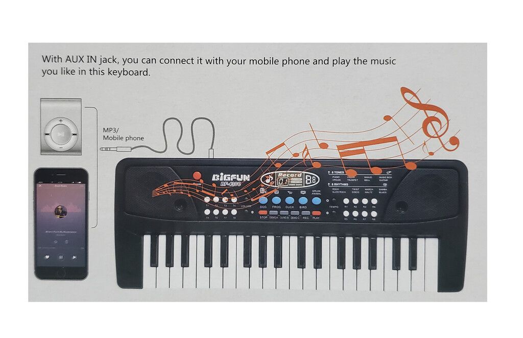 ORGANO ELECTRONICO 37 TECLAS 8 TONOS 8 RITMOS 6 DEMOS 4 PERCUSIONES CON MICROFONO CONEXION MP3 CABLE USB IMPORTANTE!! NO VIENE CON LA PILA RECARGABLE AUNQUE EN LA CAJA ESPECIFIQUE QUE VIENE