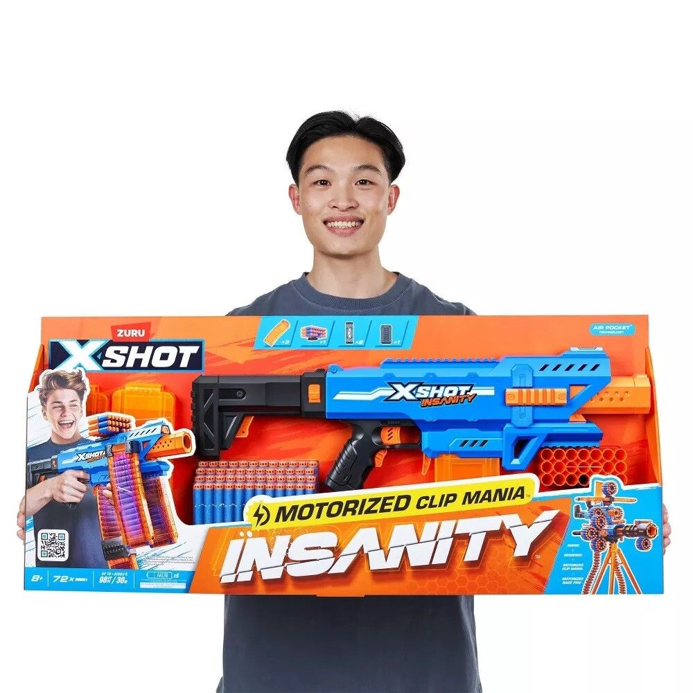 MIRA TODOS ESOS CARGADORES: !EL LANZADOR MOTORIZADO XSHOT INSANITY INCLUYE 3 CARGADORES QUE SE INTERCAMBIAN FACILMENTE PARA QUE TE MANTENGAS EN LA BATALLA AUN MAS TIEMPO! COLECCIONALOS TODOS: COMBINA TODA LA GAMA INSANITY PARA LA EXPERIENCIA DEFINITIVA DE BLASTERS !LLEVANDO TUS AVENTURAS EXPLOSIVAS AL SIGUIENTE NIVEL! POTENCIA DE DISPARO: ALCANZA MULTIPLES OBJETIVOS HASTA A 30 M / 98 PIES DE DISTANCIA. TECNOLOGIA AIR POCKET: !XSHOT INSANITY INCLUYE DARDOS CON TECNOLOGIA AIR POCKET PARA UNA RAFAGA MAS LEJANA RAPIDA Y PRECISA! COMBINACIONES DE BLASTERS INCREIBLES: !ALUCINA CON EL LANZADOR MOTORIZADO XSHOT INSANITY CLIP MANIA AL COMBINARLO CON OTROS BLASTERS DE LA GAMA XSHOT INSANITY PARA CREAR COMBOS INCREIBLES!