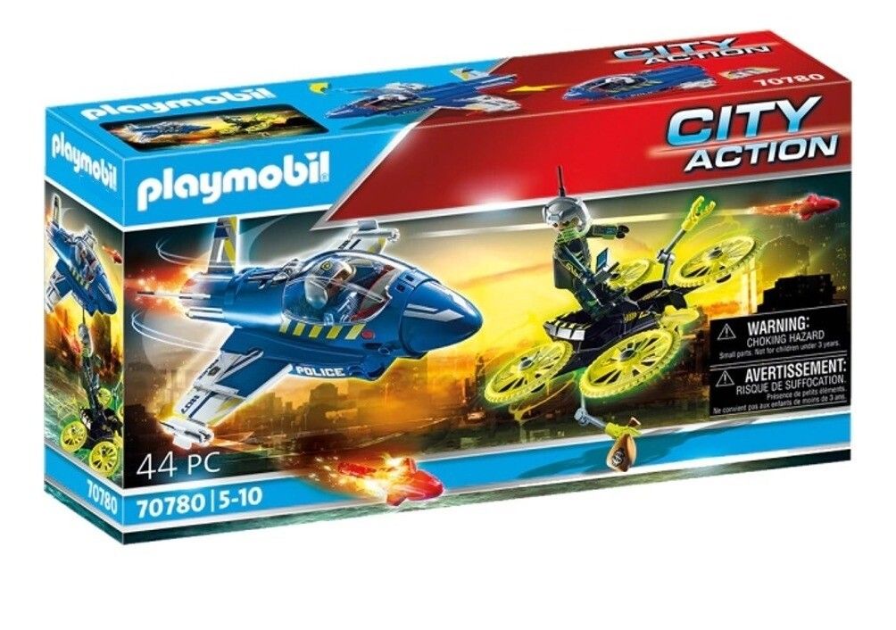PARA EXCITANTES PERSECUCIONES AEREAS! EL JET DE POLICIA PERSIGUE AL BANDIDO QUE INTENTA ESCAPAR UN INNOVADOR DRONE. MEDIDA DEL JET- 24 X 18 X 7 CM