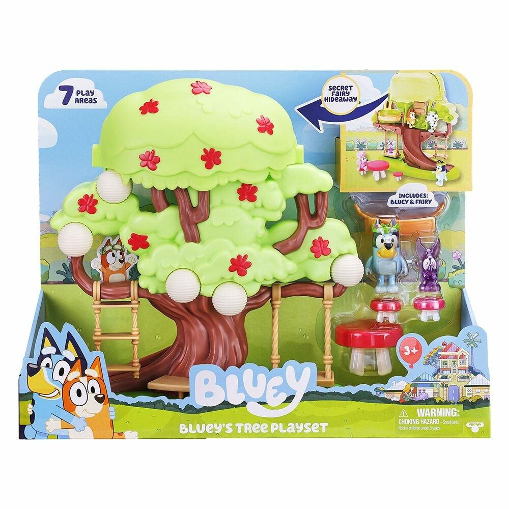 BLUEY TREE PLAYSET PLAYSET DE LA CASITA DEL ARBOL. TIENE MUCHAS CARACTERISTICAS DE DIFERENTES EPISODIOS DE LA SERIE Y SUS FIGURAS SUBEN LA ESCALERA SE HAMACAN SE DESLIZAN POR EL TOBOGAN E INCLUSO SE RELAJAN EN LA HAMACA TAMBIEN HAY UNA PUERTA SECRETA DETRAS CON UN HADA EL JUEGO BLUEY TREE INCLUYE MESA Y TABURETE STICKERS PARA QUE DECOREN EL ARBOL. LA FIGURA DE BLUEY DE 25» LLEVA UNA CORONA DE FLORES Y ESTA ARTICULADA.