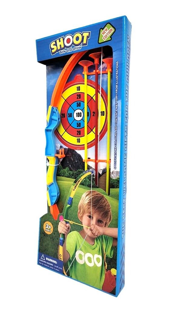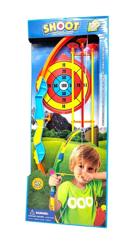 MINI SET DE ARCO Y FLECHA ESTE SET INCLUYE 3 FLECHAS INOFENSIVAS CON SOPAPA Y UN BLANCO DE CARTON DE 12 CM DE DIAMETRO EL ARCO MIDE 38 CM DE ALTO APROX. MEDIDAS DE LA CAJA: 40 CM X 15 CM X 3 CM