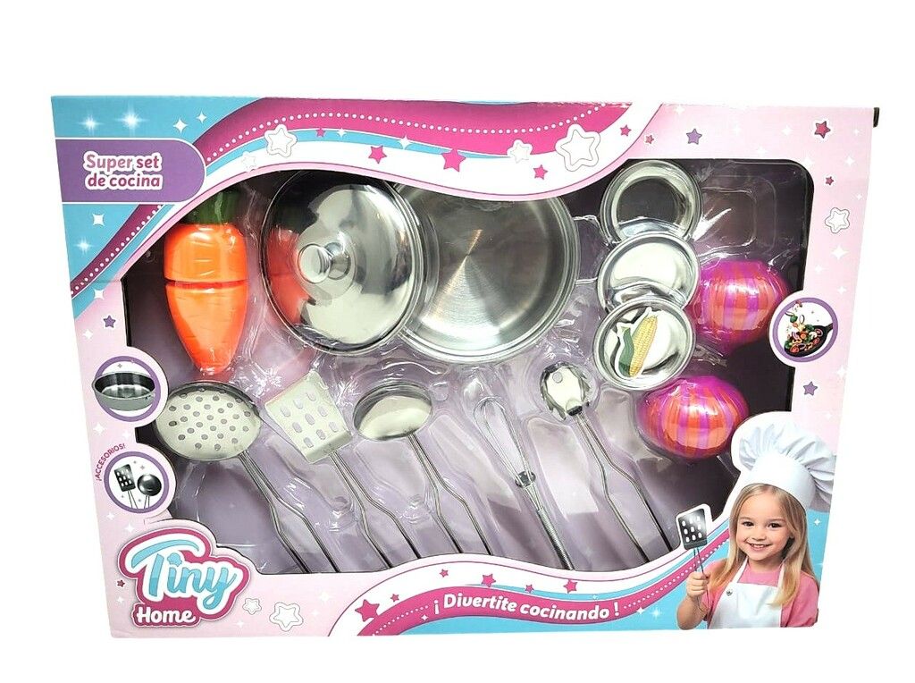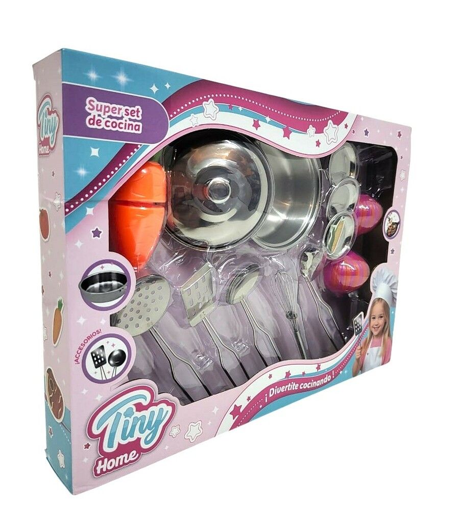 LINDO SET TINY DE COCINA CON UTENSILIOS DE METAL MAS OTROS ACCESORIOS . EL SET CUENTA CON 13 PIEZAS. CONVERTITE EN UN MASTER CHEF CON EL SET DE TINY HOME. MEDIDAS DEL PACKAGING: 36CM X26CM X5CM MARCA: TINY HOME. + 3 ANOS.