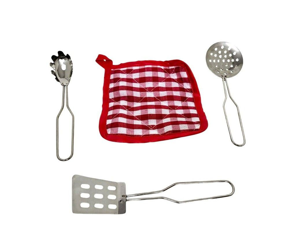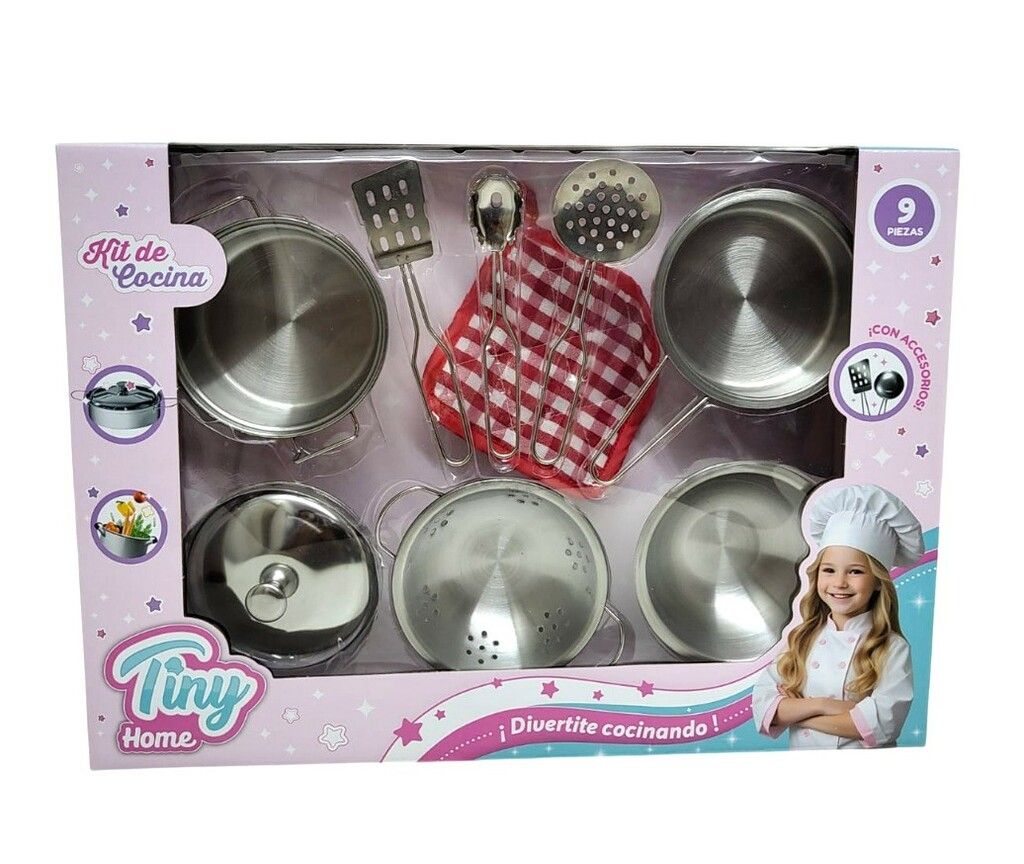 LINDO SET DE COCINA DE METAL DE LA LINEA TINY HOME. CONSTA DE 9 PIEZAS 8 DE METAL Y 1 DE TELA. LAS OLLAS Y CACEROLAS MIDEN 10 CM DE DIAMETRO APROX. LOS UTENSILIOS MIDEN 13 CM DE LARGO APROX. MARCA: TINY HOME + 4 ANOS