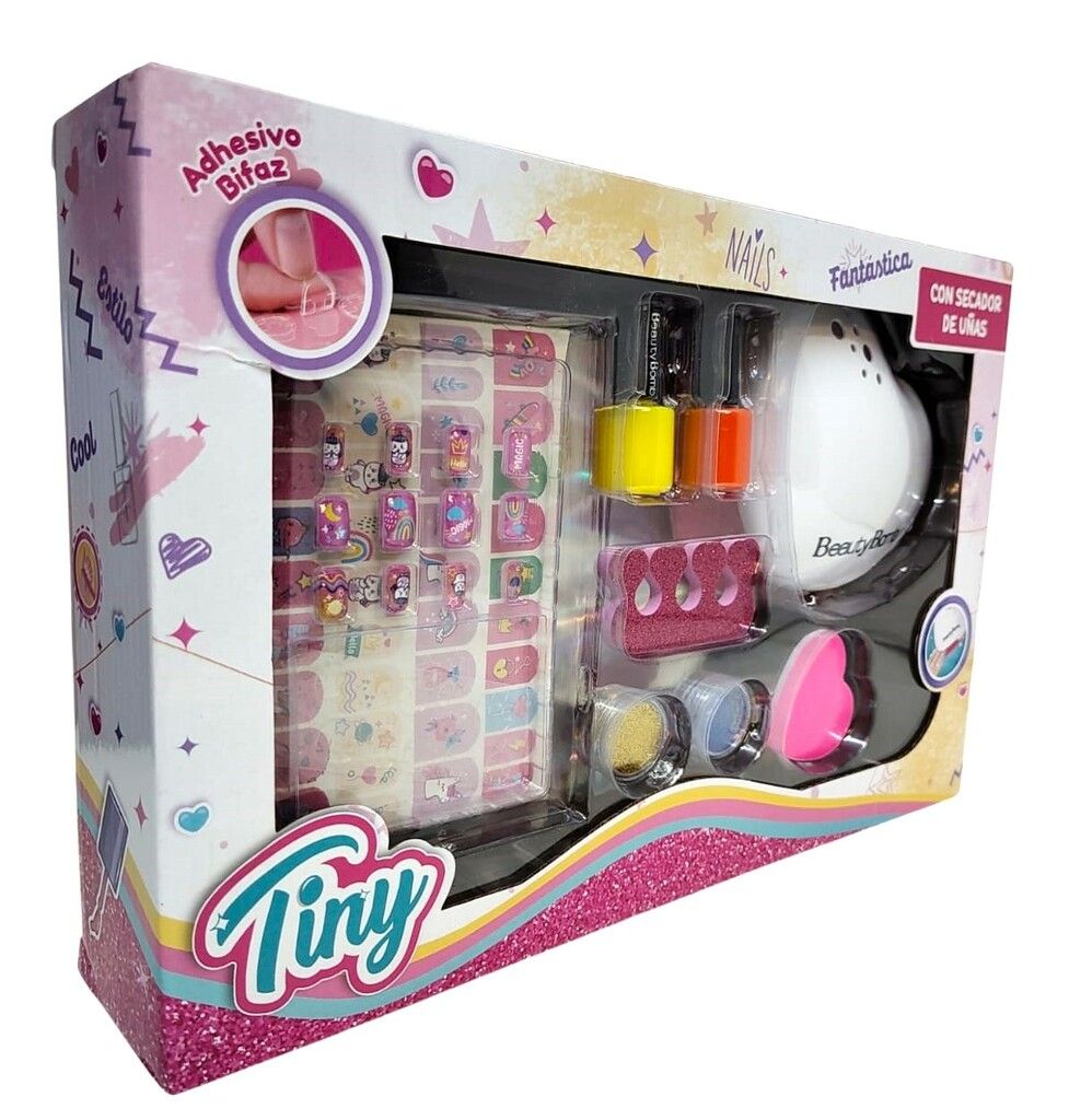 SET DE UNAS TINY AHORA CON SECADOR DE UNAS A PILAS UTILIZA 2 PILAS AA( NO INCLUIDAS). ADEMAS INCLUYE UNAS ACRILICAS2 ESMALTESSEPARADOR2 POTECITOS DE GLITTERADHESIVOSLIMA DE UNAS.