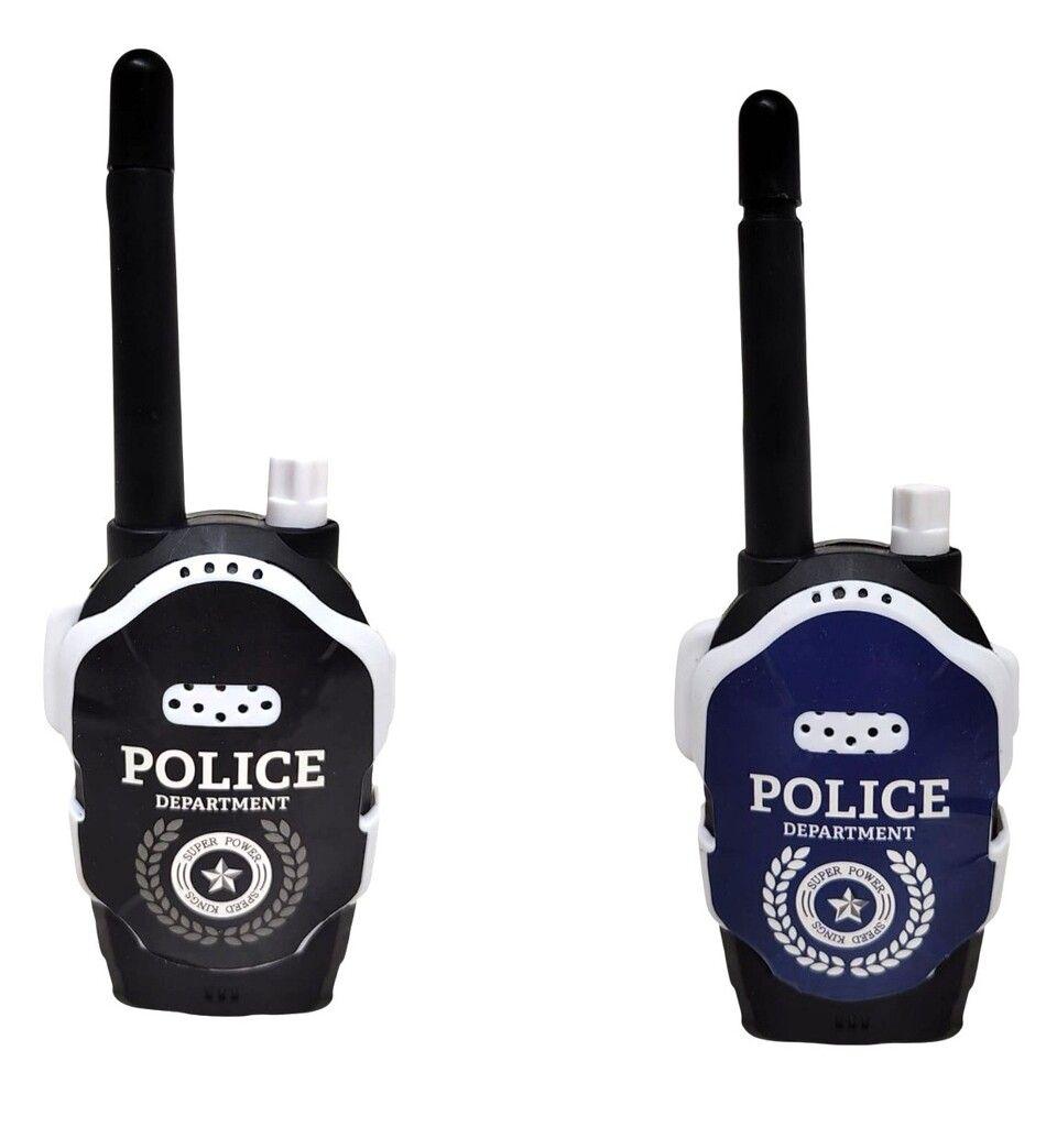 WALKIE TALKIE INTERCOMUNICADOR DE POLICIA. REQUIERE CADA WALKIE TALKIE 3 PILAS AA (NO INCLUIDAS) DE PREFERENCIA QUE SEAN ALCALINAS. TIENEN UN ALCANCE APROX DE ENTRE 10 A 15 MTS EN INTERIORES. + 3 ANOS.